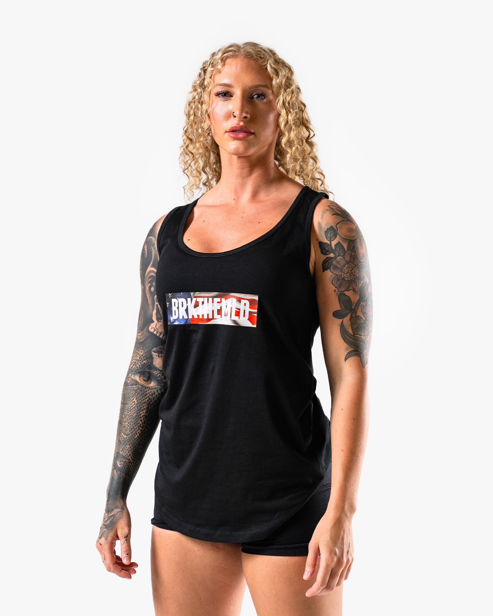 Success looks better in red, white, and blue. The racerback tank, with the signature BRKTHEMLD Box in America's star spangled banner, is the touch of freedom needed in your wardrobe. Designed with a looser fit to maximize comfort, we suggest sizing down if desiring a tighter fit.